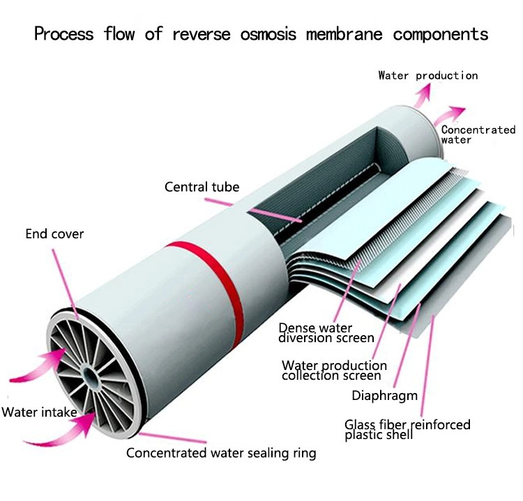 Μονάδα επεξεργασίας αντίστροφης όσμωσης, η αρχή επεξεργασίας είναι υπό τον έλεγχο της πίεσης, έτσι ώστε το μόνιμο νερό από τη μεμβράνη αντίστροφης όσμωσης να περνάει στο ανασυρόμενο νερό, ενώ το αλάτι δεν μπορεί να περάσει και μια μικρή ποσότητα οργανικών ουσιών θα συγκρατείται στο συμπυκνωμένο υγρό .